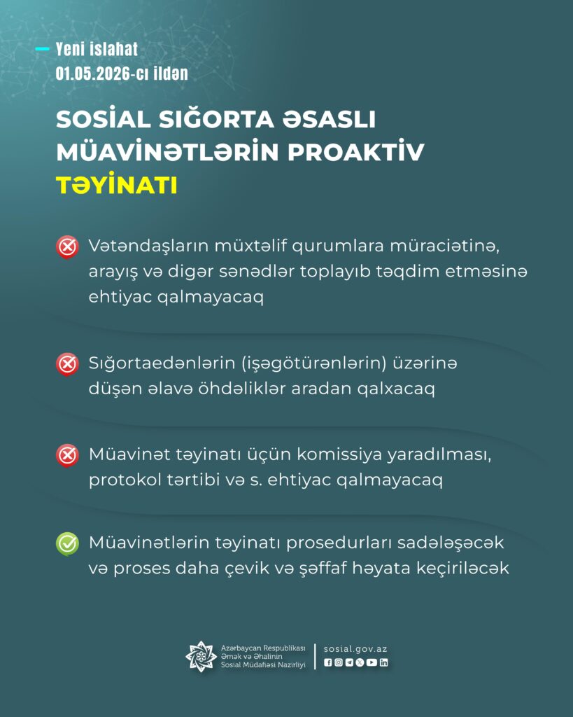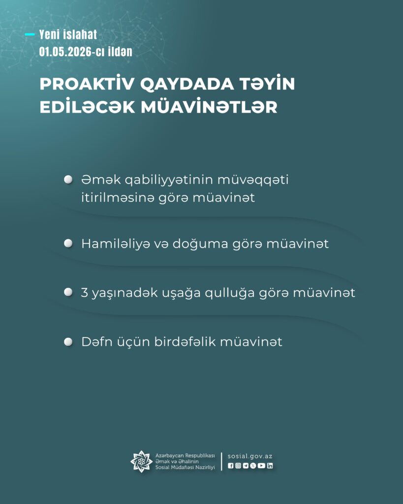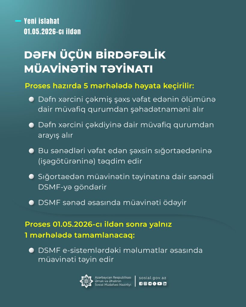 – dəfn üçün birdəfəlik müavinət bu il mayın 1-dən avtomatlaşdırılmış, proaktiv qaydada təyin ediləcək.