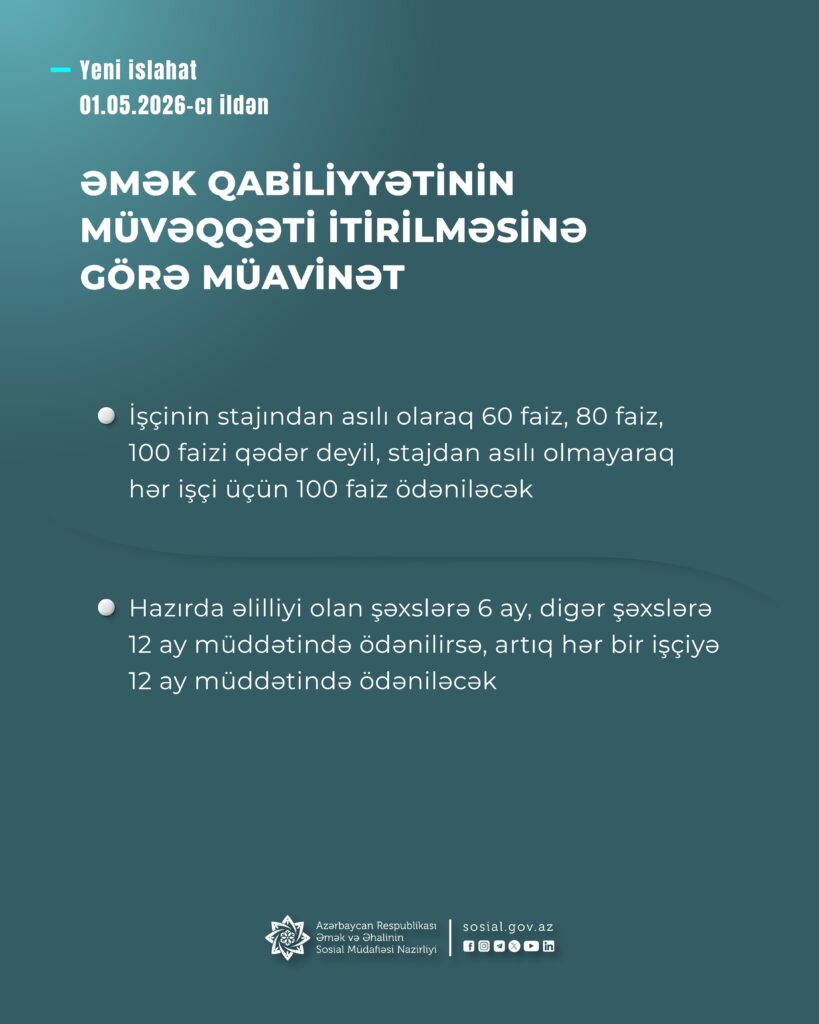 – əmək qabiliyyətinin müvəqqəti itirilməsinə görə müavinət hazırda əlilliyi olan şəxslərə 6 ay, digər şəxslərə 12 ay müddətində ödənilirsə, artıq hər bir işçiyə 12 ay müddətində ödəniləcək;
