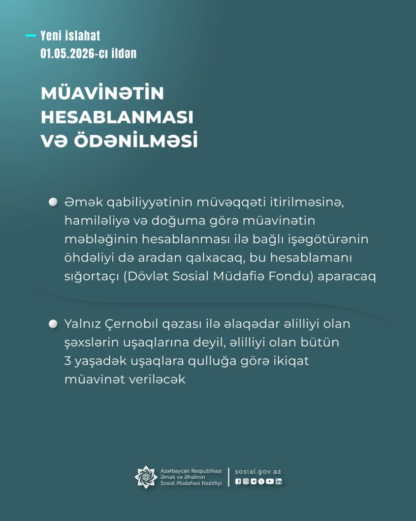 Bununla da həmin müavinətlərin təyinatı üçün işçinin müraciətinə, müxtəlif sənədlər toplayıb təqdim etməsinə ehtiyac qalmayacaq, işəgötürənin bir sıra əlavə öhdəlikləri (komissiya yaradılması, protokol, haqq-hesab cədvəli s. sənədlərin tərtibi, təqdim edilməsi) aradan qalxacaq.