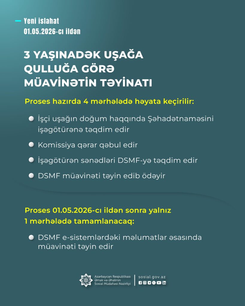 Məsələn, 3 yaşınadək uşağa qulluğa görə müavinət təyinatı üçün prosedur 4 mərhələdən (işçinin uşağın doğum haqqında Şəhadətnaməsini işəgötürənə təqdim etməsi, Komissiyanın qərar qəbul etməsi, işəgötürənin sənədləri DSMF-yə təqdim etməsi, Fondun müavinəti ödəməsi) ibarətdirsə, mayın 1-dən bu prosedur yalnız 1 mərhələ (e-sistemlərdəki məlumatlar əsasında müavinətin təyin edilməsi) ilə tamamlanacaq.